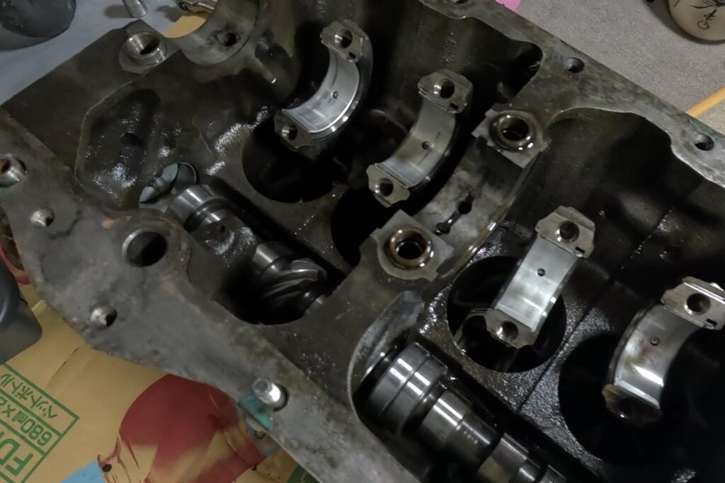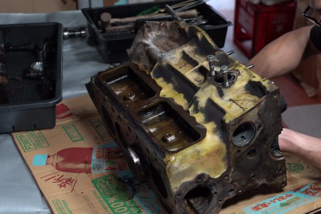 前回エンジン補器類を外してヘッドまでばらし終わったので、エンジンルームのお掃除とエンジン内部の状態確認をしていきます
