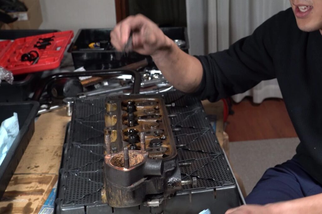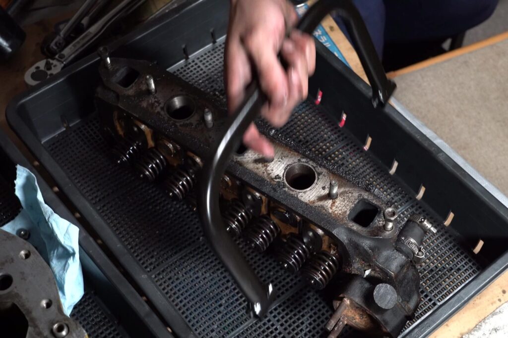 ヘッドはバルブを外したいので、バルブコンプレッサーで一つずつ外していきます