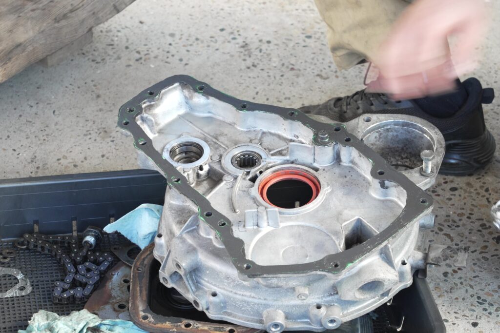 次はカムギア側ですね。バックプレートを取り付けて。ガムギアとクランクシャフトのギアのアイマークを合わせて組付けます。画像で外れていますが、回して確認していたためです